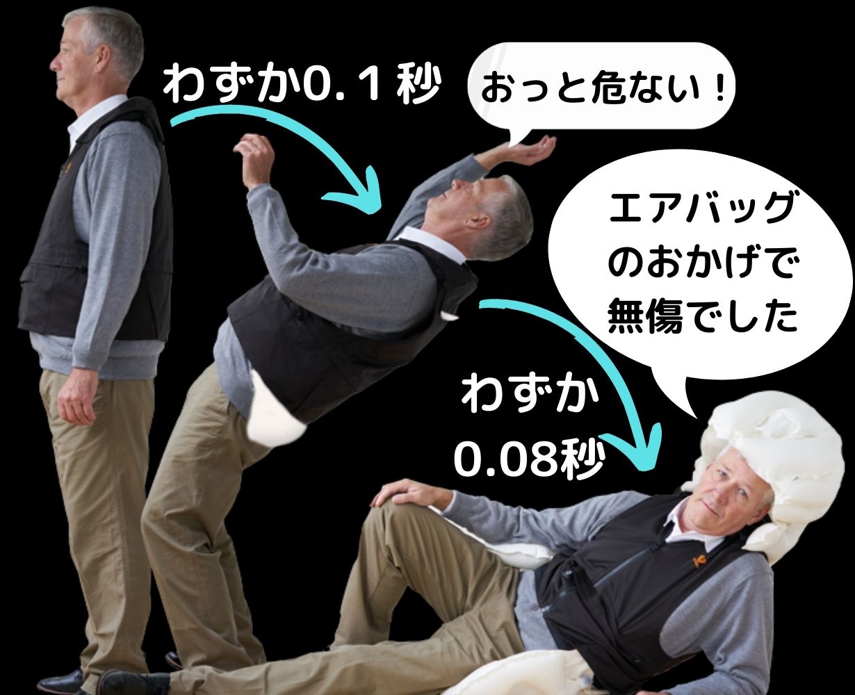 エアバッグは頭部、頸部、背部、腰部、骨盤の全周囲を守るように作動するため、大怪我を防ぎます。